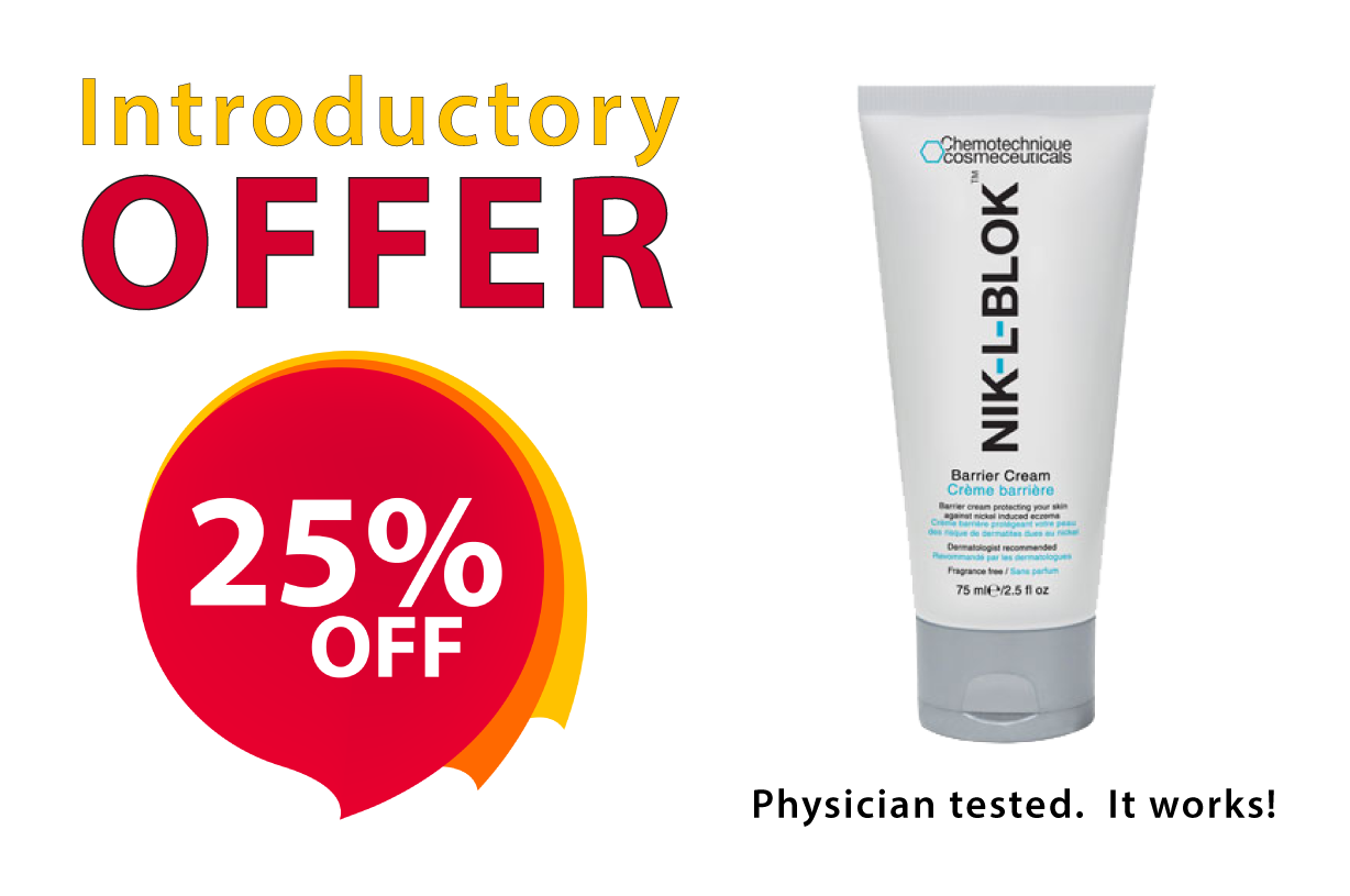 NIK-L-BLOK™ is a revolutionary skin barrier cream with a patented formula that traps nickel or cobalt ions effectively protecting the skin against developing ACD. The patented formula of NIK-L-BLOK™ uses a metal ion chelator to bind the ions from nickel … preventing the ions from penetrating the skin.